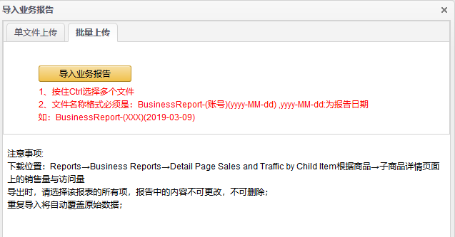 1、在使用之前,你需要先導(dǎo)入相應(yīng)日期的業(yè)務(wù)報告,我們將根據(jù)您查詢的日期范圍和已導(dǎo)入的業(yè)務(wù)報告日期,來進行數(shù)據(jù)統(tǒng)計和展示。