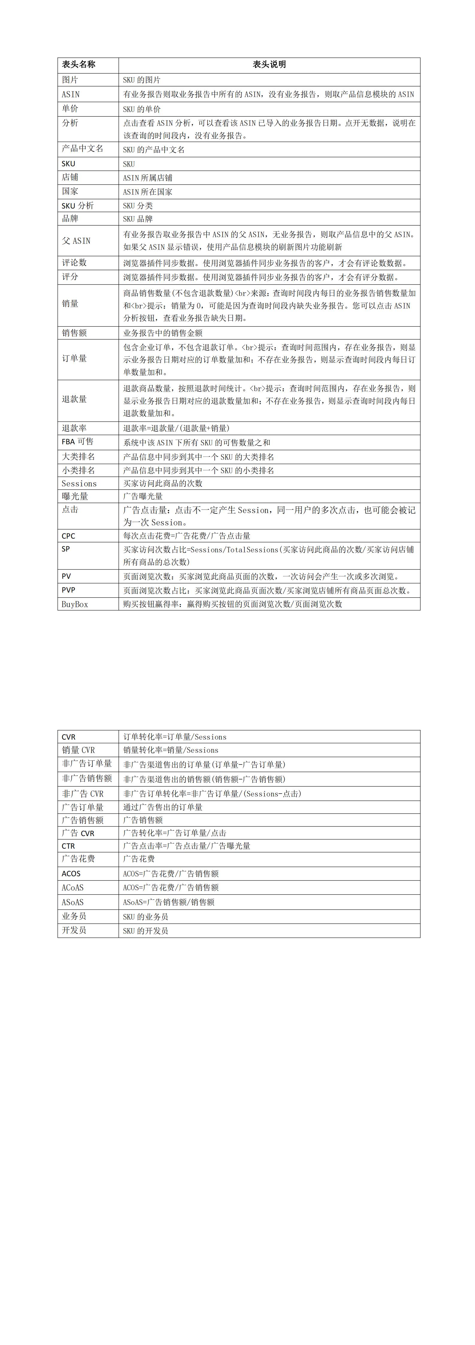 根據(jù)您查詢的日期范圍和已導(dǎo)入的業(yè)務(wù)報告日期,我們將為您展示ASIN的產(chǎn)品名稱、SKU、店鋪、國家、分類、品牌、父ASIN、評分、評論數(shù)、銷量、銷售額、訂單量、退款量、退款率、FBA可售、大類排名、小類排名、買家訪問次數(shù)(Sessions)、廣告點擊量(click)、廣告曝光量、廣告每次點擊花費(CPC)、買家訪問次數(shù)占比(SP)、頁面瀏覽次數(shù)(PV)、頁面瀏覽次數(shù)占比(PVP)、購買按鈕贏得率(BuyBox)、訂單轉(zhuǎn)化率(CVR)、銷量轉(zhuǎn)化率(銷量CVR)、非廣告訂單量、非廣告銷售額、非廣告轉(zhuǎn)化率(非廣告CVR)、廣告訂單量、廣告銷售額、廣告轉(zhuǎn)化率(廣告CVR)、廣告點擊率(CTR)、廣告花費(cost)、廣告花費在廣告銷售額中占比(ACOS)、廣告花費在總銷售額中占比(ACoAS)、廣告銷售額在總銷售額中占比(ASoAS)、業(yè)務(wù)員、開發(fā)員等數(shù)據(jù),您可以根據(jù)自己的需求,自定義顯示您希望展示的數(shù)據(jù)。