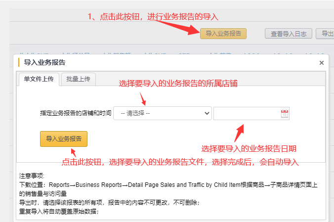 進入“報表→產(chǎn)品表現(xiàn)”頁面,點擊列表右上角的“導(dǎo)入業(yè)務(wù)報告”按鈕,在彈出的窗口中→1)選擇店鋪→2)選擇日期→3)選擇文件。