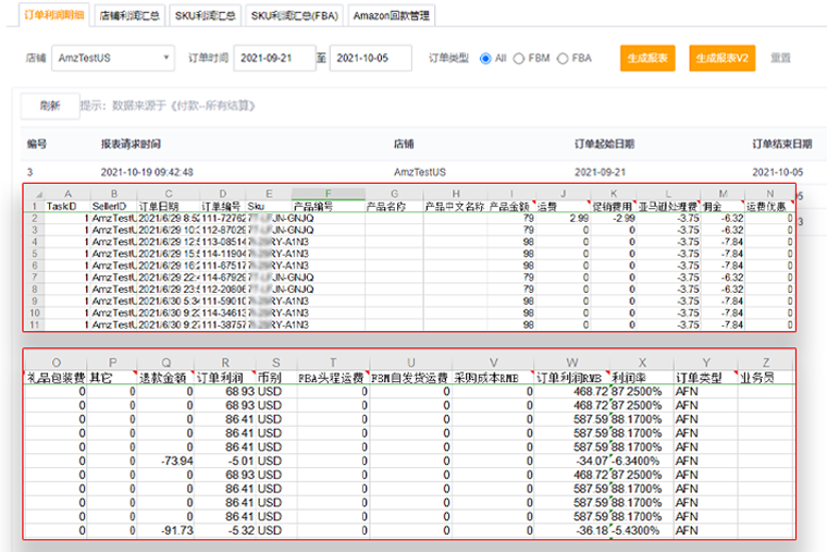 訂單利潤明細(xì),統(tǒng)計(jì)每個(gè)訂單中利潤已考慮產(chǎn)品成本、退款、FBA倉儲(chǔ)費(fèi)、廣告費(fèi)、運(yùn)費(fèi)等;